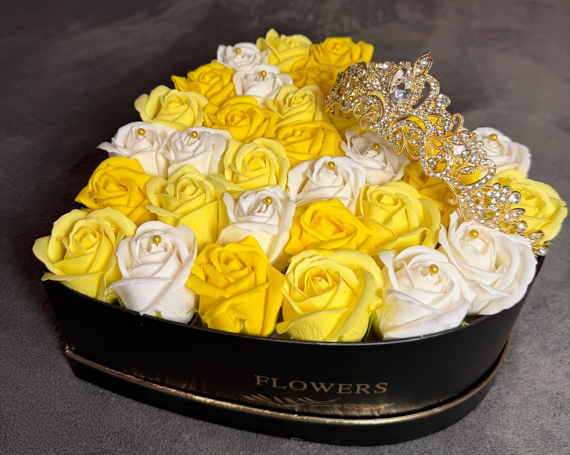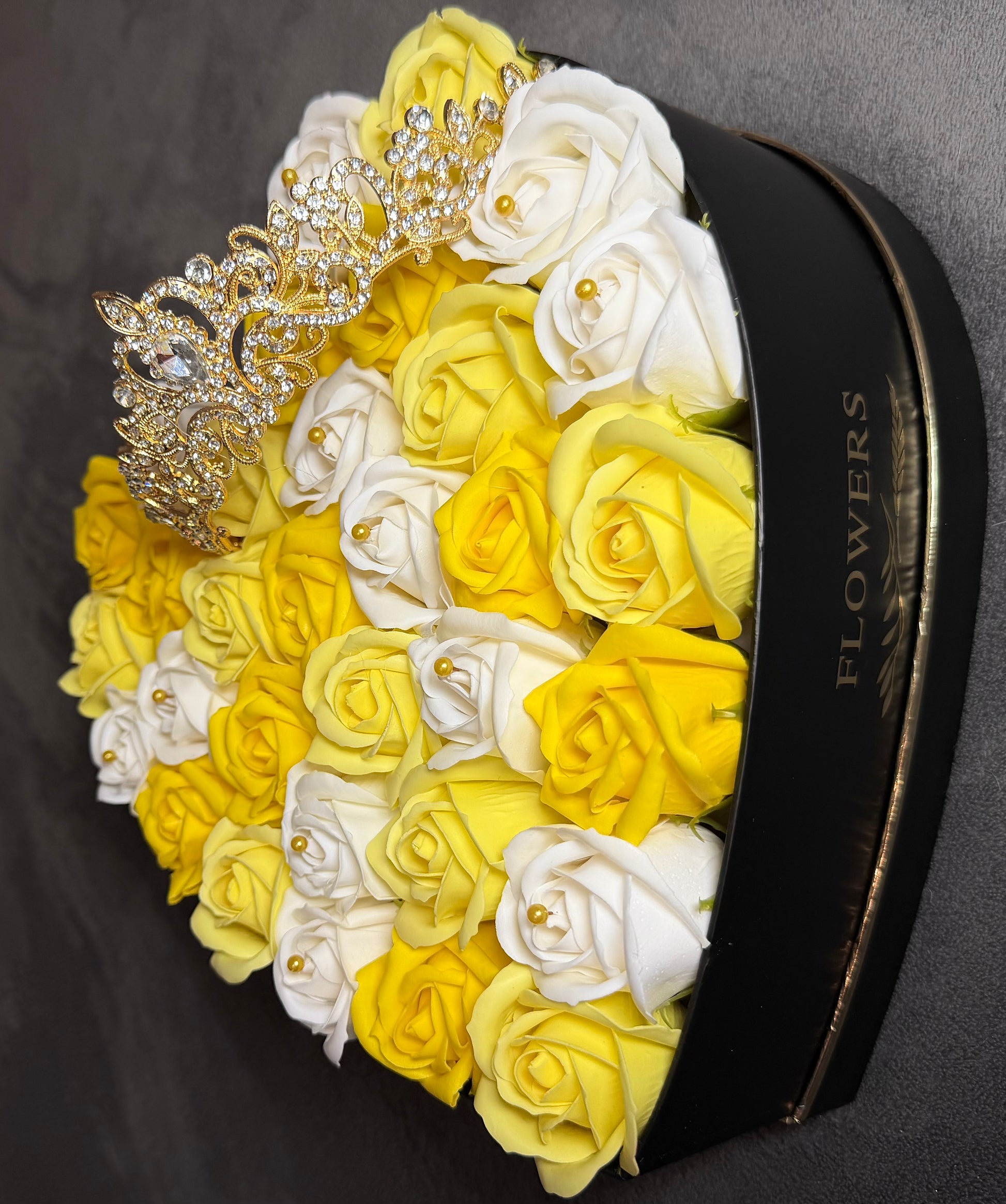Inimă Imperială îmbină energia trandafirilor galbeni cu puritatea celor albi, într-o compoziție echilibrată și elegantă, realizată într-o cutie premium în formă de inimă. Contrastul cromatic creează un impact vizual puternic, ideal pentru cadouri cu semnificație și stil.