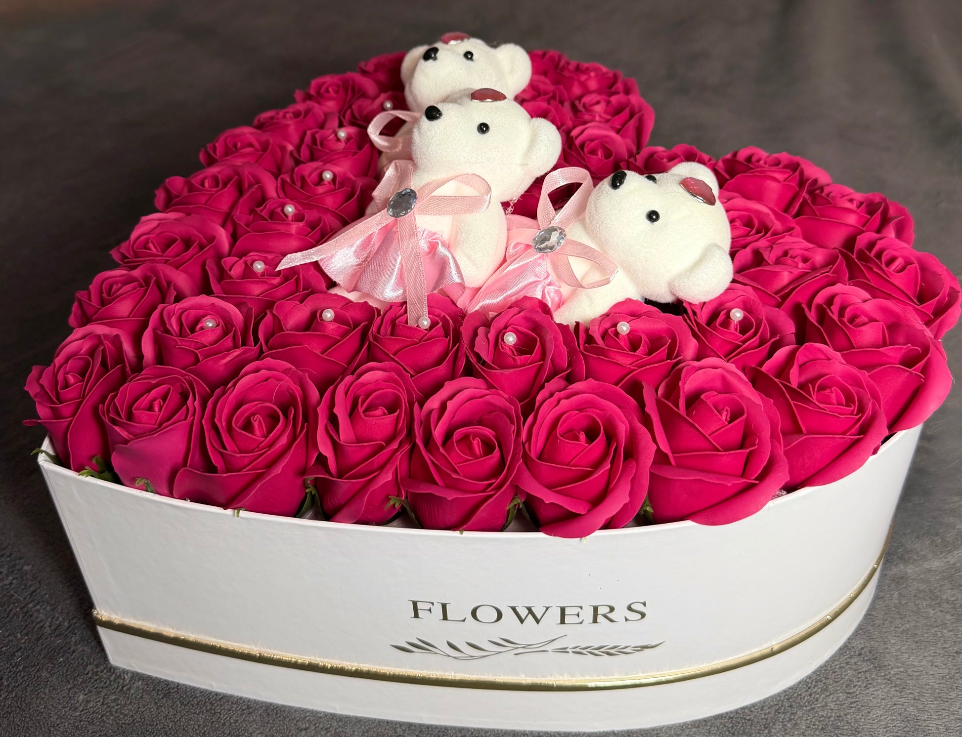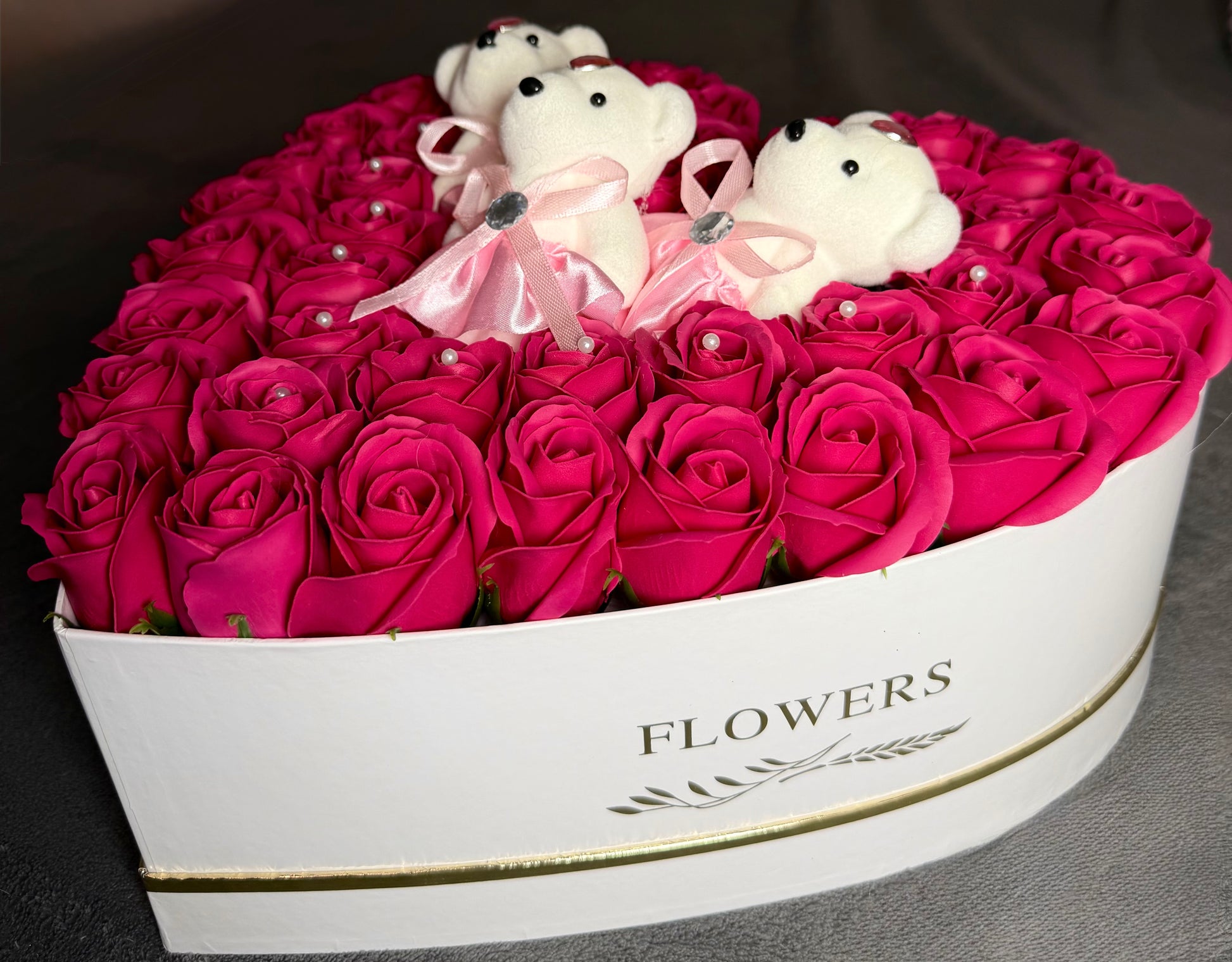 O cutie elegantă în formă de inimă, plină cu trandafiri roz intens, aranjați perfect pentru impact vizual maxim, completați de trei ursuleți decorativi, simbol al afecțiunii, protecției și iubirii sincere. Un aranjament care transmite grijă, rafinament și intenție clară.